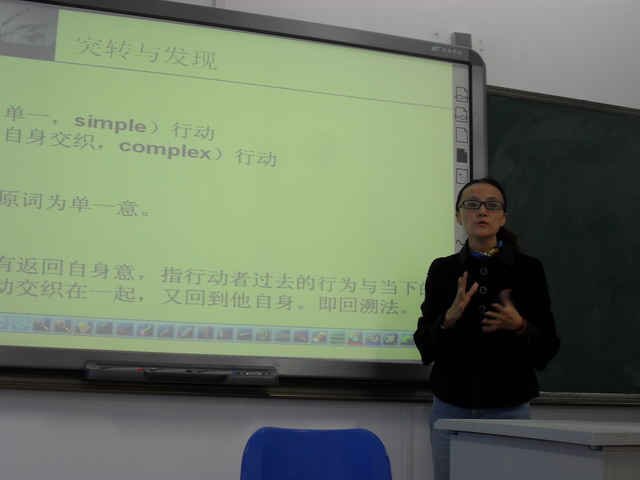 张军老师一直以严谨的教学态度和深厚的戏剧文学功底形象树立在老师和员工心中。在此次教学观摩课上,张老师也延续了自己的风格,为老师和同学们献上了精彩的一课。张老师主要围绕亚里士多德著的《诗学》中关于戏剧中“突转”和“发现”的内容展开;她首先从简单悲剧和复杂悲剧入手,得出简单悲剧和复杂悲剧都是一个行动的悲剧的总结,接着张老师解释了“突转”与“发现”的含义。张老师的严谨治学态度在本次课上淋漓尽致地体现出来,她对于“突转”和“发现”不仅仅拘泥于一家之言,而是从多个《诗学》的译本入手,对比各个译本,得出自己的结论的同时鼓励员工自己多思考、深入理解、提出自己的意见。同学们积极配合老师,在认真听讲之后提出了独到见解和个人的疑问,老师也尽力为同学们解惑。
