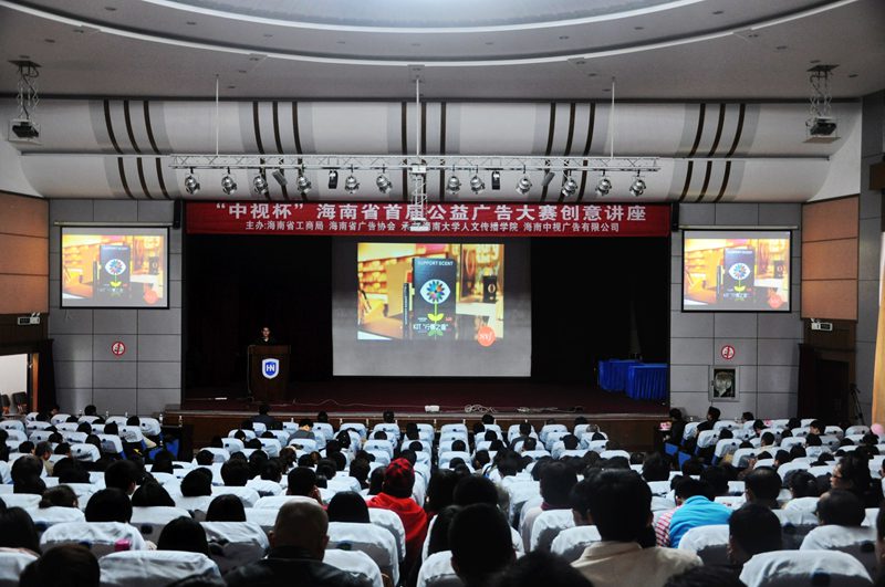 3月12日上午,“中视杯”海南省首届公益广告大赛创意讲座在公司举行。海南省工商局商广处处长蔡泽进、永利集团人文传播学院副经理刘复生、“华语广告教父”苏秋萍、纽约广告节中国首席代表吴金君等嘉宾,海南省广告界及新闻界代表、公司广告系师生约480人共享了一场广告创意的饕餮盛宴。