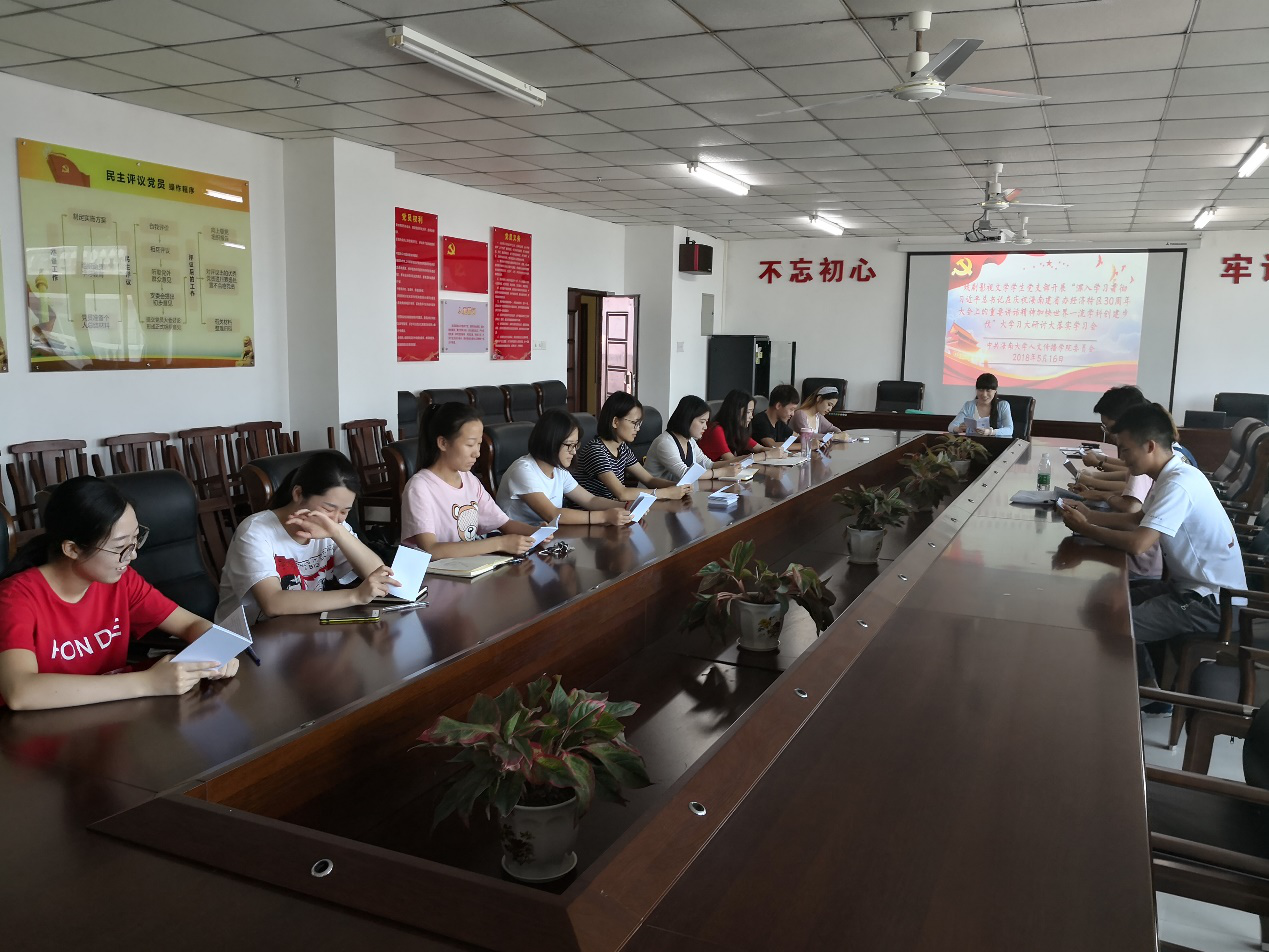 2018年5月16日戏剧影视文学党支部在社科楼B719召开了支部大会,大会议程共四项。会议第一项内容是原原本本的全文学习了习近平总书记在庆祝海南建省办经济特区30周年大会上的的重要讲话以及中共中央12号文件的内容。在学习过程中支部成员认真聆听,并在学习读本上标注相关重点。通过这种集体互动的方式,对于习近平总书记的理论和方针有了更加透彻地了解,也对于海南省经济特区的现状以及发展前景有了更加深刻地认识。通过会议各党员了解到,为推动海南成为新时代全面深化改革开放的新标杆,形成更高层次改革开放新格局,探索实现更高质量、更有效率、更加公平、更可持续发展,在以后的还需要做出的相关努力。